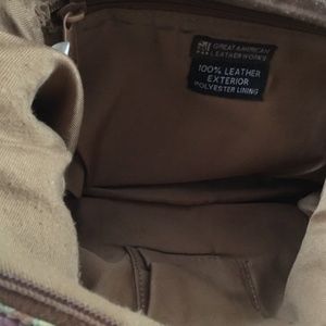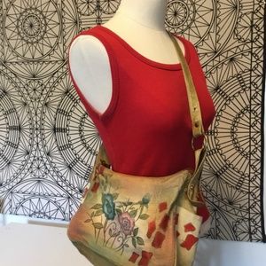 100% genuine leather handbag from the Great American Leather Works. Hand painted with floral and geometric detail, and vintage inspired. Big enough to carry a lot more than just everyday items like phones and keys. Long enough to be a shoulder bag as well.