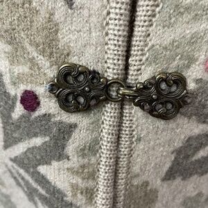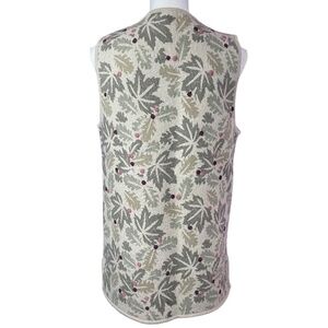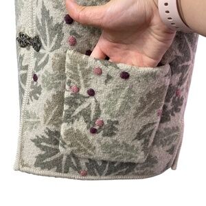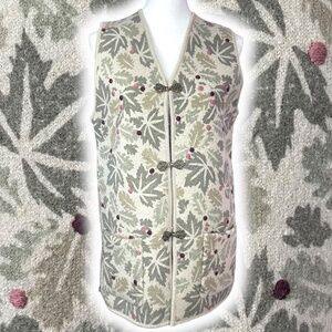 Gorgeous pure wool vest in a straw beige color by Woolrich with sage and pine colored maple and oak leaves throughout. Embroidered pink and burgundy / purple dots or berries. Fancy metal clasp closures. Excellent condition.