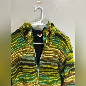 100% Wool Jacket Chunky Pixie Hood Knit Unisex Boho Fleece Lined Warm Cardigan. L/XL. Full zip. Fleece lined. A few stray strings and a hole on the back right shoulder, but does not go through the fleece layer.