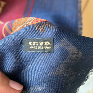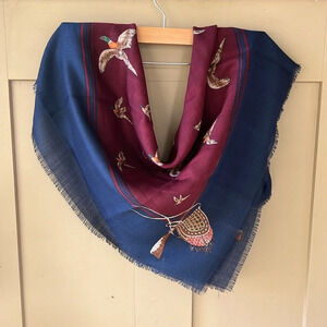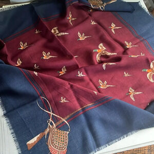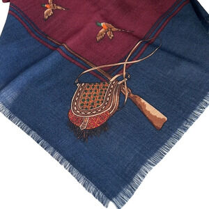 100% Wool Japan Navy Burgundy Equestrian Hunter Novelty Print Scarf Square 35”