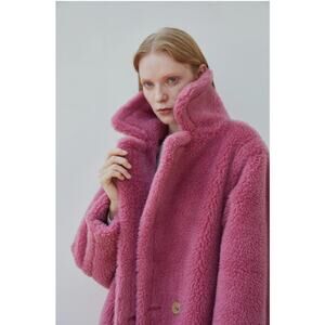 pink coat, pink winter coat, teddy coat, soft woolen coat, 100% wool coat, cocoon coat, double-breasted coat, oversized coat, designer coat, pissenlit coat, limited edition.