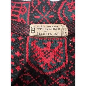 Made in Austria, Peter Geiger for Beconta Ski 100% Wool Ski Sweater is a vintage piece from the 1960's with a unique design suitable for street and slope wear as well as traveling, parties, casual wear, and Apres Ski. Made in Austria of 100% wool this tight-knit sweater features a boat neck and long sleeves for warmth.
