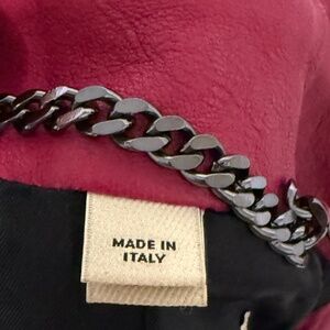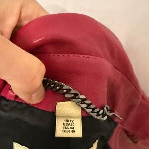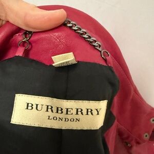 This jacket is a 100% authentic Burberry London Women's lambskin leather Moto jacket in a size 10/UK 12. It features a stylish raspberry color, with a biker theme inspiring its design. The jacket is made of high-quality lambskin leather and accented with zipper closures, making it a trendy and versatile addition to any woman's wardrobe. The regular fit and polyester lining provide comfort and a flattering silhouette, perfect for any casual or stylish outfit. The jacket practically brand new and ready to become the perfect addition to your closet. the block snap buttons line the front and are offset by the zippered front pockets. Length of arm is 26", across the back is 18", and chest is 31". This coat is Burberry perfection and comes from a smoke free home and well cared for.