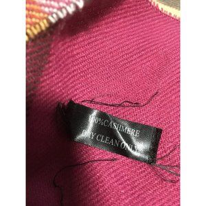 100% cashmere multi colored plaid scarf with fringe 13”x66”. Good pre-owned condition. Dry clean only. Accidentally pulled string on other side, and tag pulled loose. Edges might have some minor fraying.