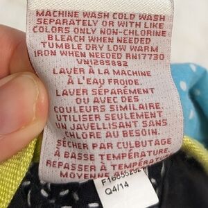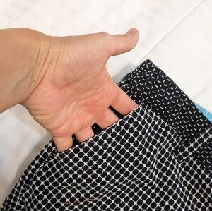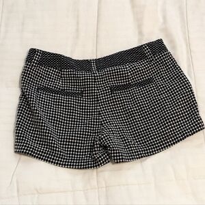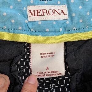 100% cotton Merona shorts size 2. please have lots of fun patterns on them. the main one being sort of a black and white polka dot. it has a single button and zipper closure, two front pockets, and two back pockets were the seams have not been ripped out yet. it doesn't have a lot of stretch. the waist measures 15 in, the rise measures 7 1/2 in, and the inseam measures 3 in. these are a fun twist on a classic pair of shorts