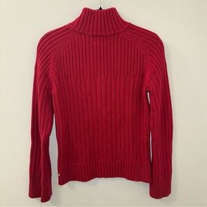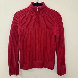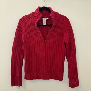 cozy, vibrant red half-zip sweater. Heavy, chunky knit. excellent quality.