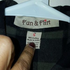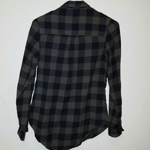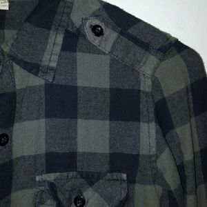 100% cotton army green and black plaid button down. Wasked and worn. Shows signs of wear.