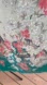 This Japanese scarf has a soft cherry blossom print with hues of pink and turquoise. There are some light stains that might come out at the dry cleaner.