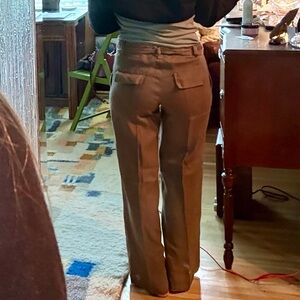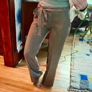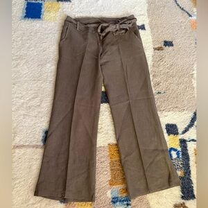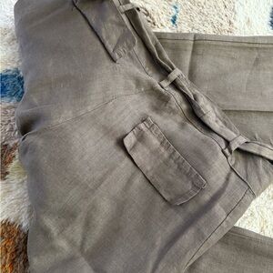 Low rise trouser pants, perfect for summer. Breezy linen, can be worn out and about or to the office. Purchased at a boutique in Spain. No size tags, fits like US size M. 17” across waist (low rise, these sit more on the hips), 9.5” rise, 29.5” inseam. I’m size 26 in jeans for reference and the waist is too big without the belt, but thigh part is perfect.