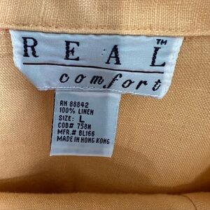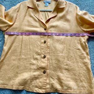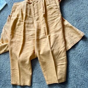 100% linen peach women’s button down top size L and women’s linen peach cropped pants. 3/4 length cuffed sleeves. Beautiful set perfect for spring! Very soft! EUC