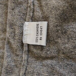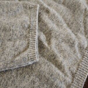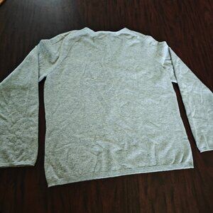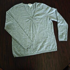 Light, luxurious pale grey V-neck pullover sweater with pleated detail, size XL. 100 percent cashmere. Narrow ribbing on cuffs and V-neck. Measurements (unstretched): pit to pit 20 inches, neck to hem 24.5 inches, shoulder to cuff 24.5 inches. No odors, stains or pilling, just a bit wrinkled. Weightless, soft and warm.