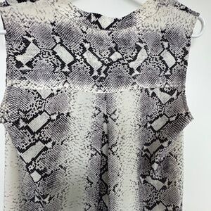 Silk sleeveless shirt dress with hi-low hem and snakeskin print.