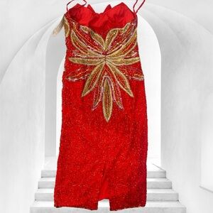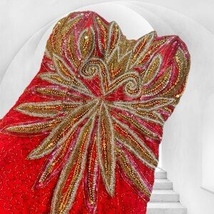 100% silk Vintage AVANI Evening sequin red gold strapless cocktail dress small
