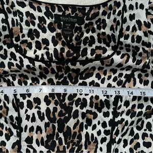 White House Black Market 100% silk blouse. Brown, black and gold colors on this short sleeved cheetah print top. Black piping accents curves in for a slimming effect. This is a beautiful soft silk blouse in excellent condition. US size 4 with a pit to pit of 18” and the length is 23”. Smoke free pet friendly home.