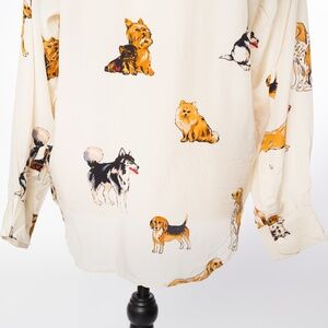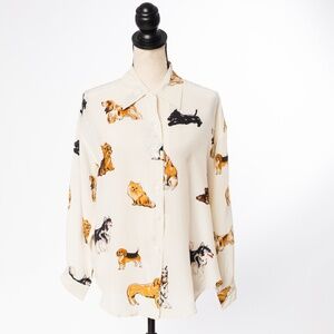 Vintage 100% silk blouse covered with various dog breeds perfect gift for a dog lover cream with neutral colored dogs in tan, black, brown, gray by Fu Da size M. Great statement blouse with point collar timeless classic blouse to add to your wardrobe. Gift for her. Natural fabric sustainable fabric. 90s blouse