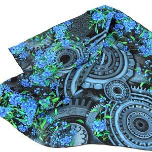This luxury 36"x36" pure silk charmeuse scarf blends steampunk precision with floral tenderness: intricate gears, ball bearings, and lace intertwine with delicate blue forget-me-nots—a visual meditation on the balance between logic and love, structure and soul.