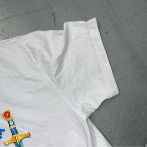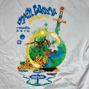 White t-shirt featuring a vibrant graphic design with blue, green, and yellow accents.