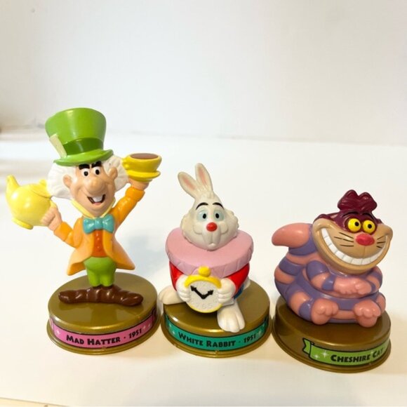 Explore Wonderland with this Disney figurine set. Includes a green Mad Hatter, a white White Rabbit, and a purple Cheshire Cat. Perfect for play and display.