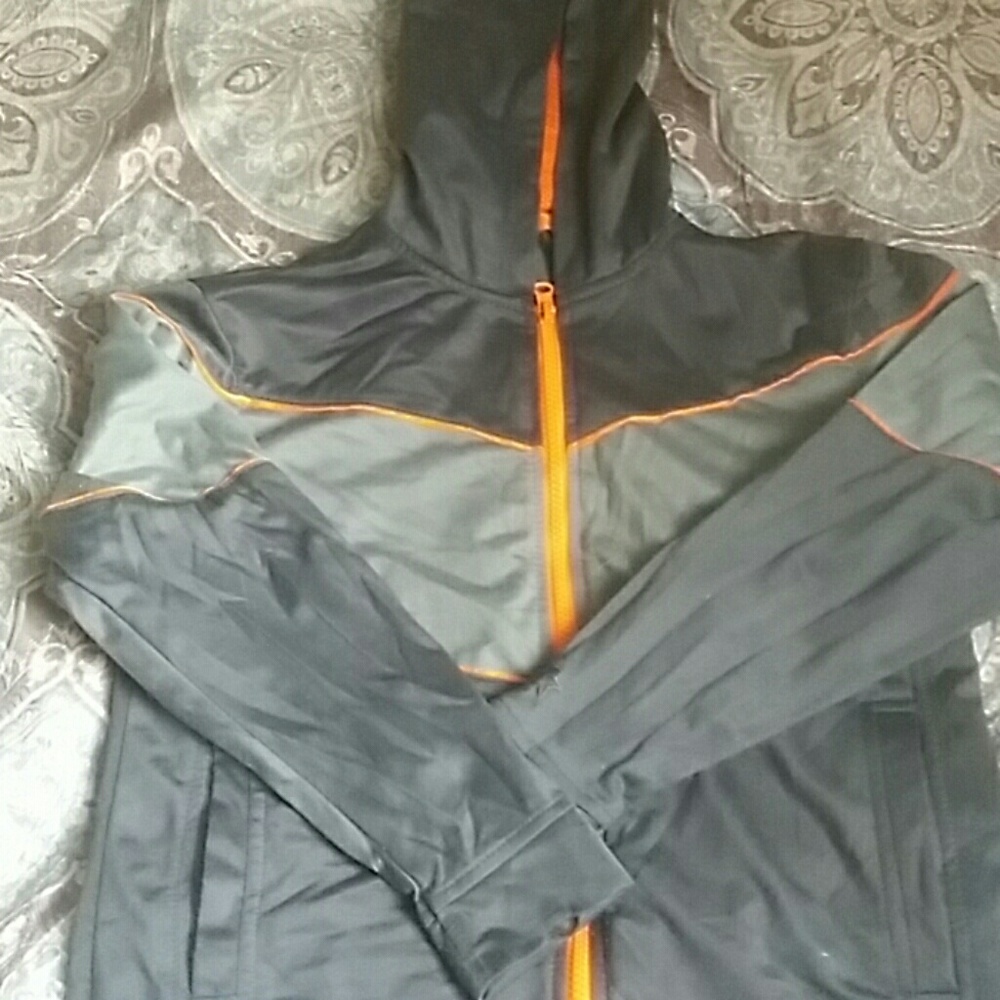 It is a grey and orange jacket with a hood on it and perfectly good shape!