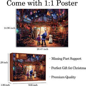Size: The Finished size of 1000 Pieces Christmas Jigsaw Puzzles is 20.5"x15". Each puzzle is thick and connected well. The puzzle features Dad Kids in the colorful Christmas house with beautiful light bulb on. They are very thrilled with the scene.