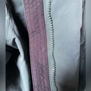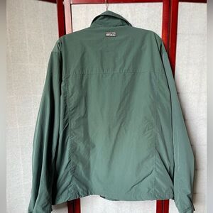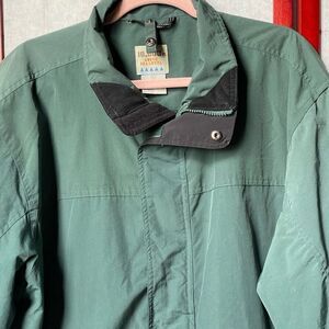 Men’s full zip lightweight jacket, perfect for the fall and spring. Extra zipped pockets on the inside as well as on the hips. Elastic on the bottom, and adjustable fabric on wrists. This jacket is missing the hood, and there is a small discoloration on the inside of the zipper. Other than that, this jacket is in excellent condition!