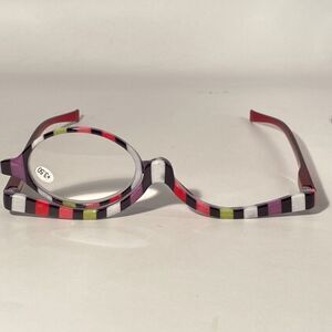When you unpack your makeup glasses, you might be surprised. They have only one lens, it's intentional. These glasses feature a half frame and a single lens, allowing you to enhance one of your eye's vision, while applying makeup to the other. The open top portion gives you plenty of space to maneuver cosmetic tools. The lense is hinged, easily rotating from one side to the other side.