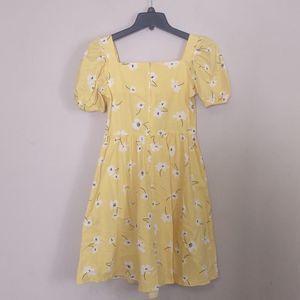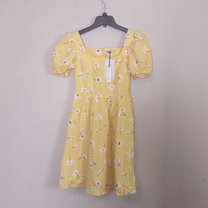 LCW Vision Square Neck Straight Balloon Sleeve Poplin Cotton Dress in Yellow Floral