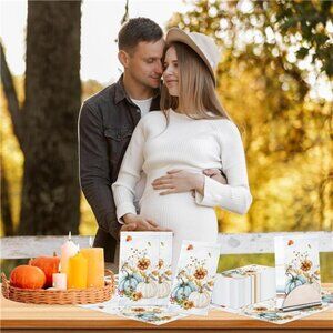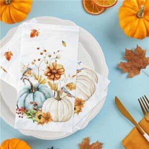 【Fall Pumpkin Theme】Our fall paper napkins combine blue and white pumpkins with blooming fall flowers, maple leaves, cranberries and magpies. Delicate design adds a festive touch to fall theme party.