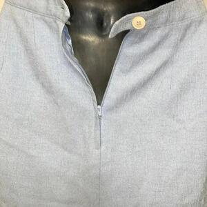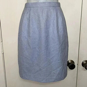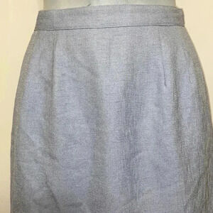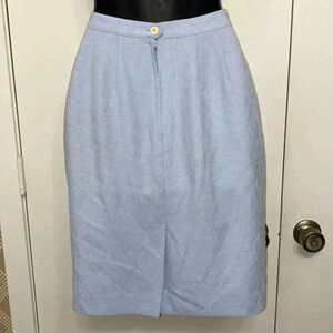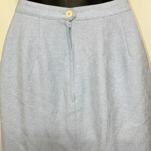 Dry clean only, both skirt & lining-💯 % polyester, sewn-in lining/slip, buttons & zips, plus a slit in back, Very Professional/Business/Formal attire, pastel blue makes the brown 👁️ Pop! Attached strings for hanger