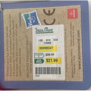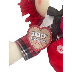 Celebrate the 100th anniversary of Raggedy Ann and Andy with this beautiful handmade doll by Aurora. This 16-inch rag and cloth doll features bright red hair and is made of high-quality cloth material. The doll is part of the Anniversary Dolls product line and was manufactured in 1997.
