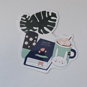 Adorable sticker with a bedtime theme. Features a book, plant, and mug with a bunny. Perfect for decorating notebooks or laptops.