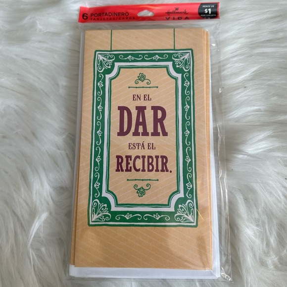 Set of 6 decorative Spanish money holders. Features a green and tan design with a motivational phrase.
