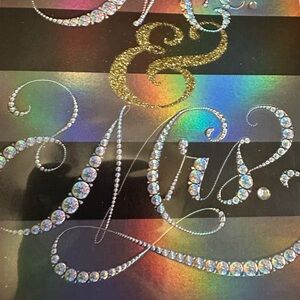 Elegant notebook with 'Mr. & Mrs.' in rhinestones on a striped cover. Features a rainbow effect.