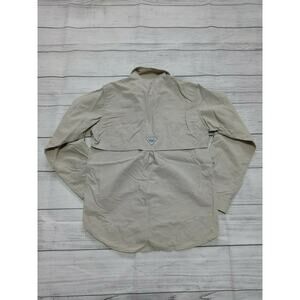 VGUC Columbia Omni-shade button up shirt. Beige. Large cargo style chest pockets. Sleeves have a button and strap to hold them rolled up if desired. Very lightweight, great for outdoors during warm months. Light wash wear