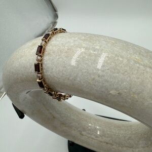 16 pieces of GENUINE Garnets 6x4mm quality AAA no treatment. 6 pieces of GENUINE single cut diamonds, I color & SI Clarity no treatment.10.85 grams of base metal layered with 18K yellow gold.The length is 7 1/2 inches.The width is 1/4 inches or 6mm.