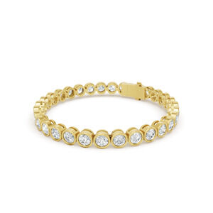 This 10.19 ctw Diamond Bezel 14K Yellow Gold Tennis Bracelet features radiant diamonds individually framed in smooth bezel settings for a clean, contemporary look. Crafted in rich yellow gold, it offers continuous brilliance with a warm, luxurious finish. Timeless yet modern, it’s perfect for elevating both everyday style and special occasions.