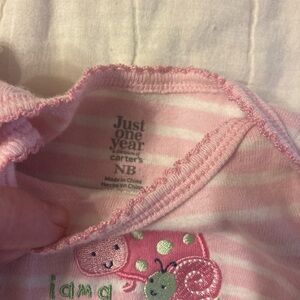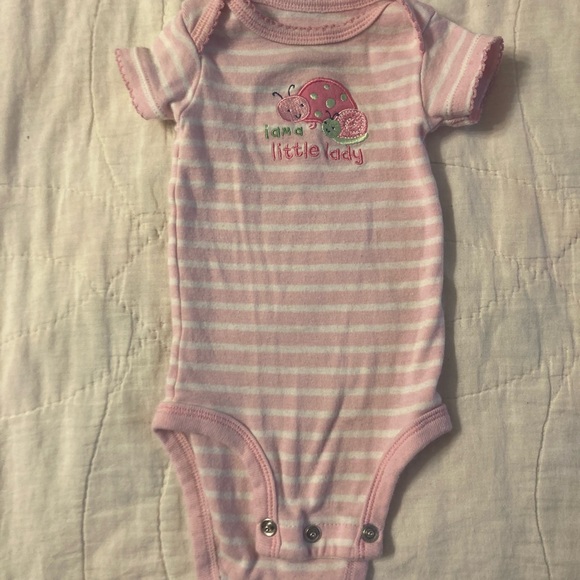 Adorable pink striped onesie with a cute ladybug design. Perfect for your little lady's wardrobe. Make your own bundle and I’ll be glad to give you a great price.