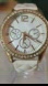 Good used condition. There's very little wear on the strap. Watch features a goldtone bezel with rhinestones, white dial with goldtone hour markers, 3 subdials that are just for looks, and a white quilted leather strap. Case diameter is 36mm. Watch has a new battery in it also. Really pretty watch.