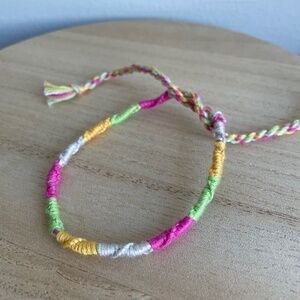 A handmade bracelet or anklet woven with shades of pink, green, and white colors. A friendship or statement bracelet perfect for this summer! Approx. 9 inches/ 30 centimeters long. 10 woven bracelets for $25.