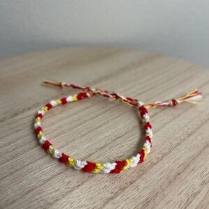 A handmade bracelet or anklet woven with shades of white, yellow, and red colors. A friendship or statement bracelet perfect for this summer! Approx. 9 inches/ 30 centimeters long. 10 woven bracelets for $25.