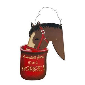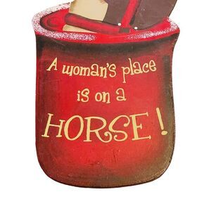 A Woman's Place is on a Horse Metal Wall Sign. Good condition.