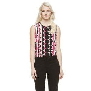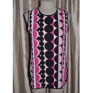 Get a rush from this sweet as candy top. A groovy vertical print of crescents and circles looks pop-art-pretty in black, white and shades of pink. Black piping trims the side-vented sleeveless top for a neat finish.