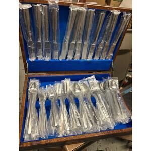 12 place settings (knife, dinner fork, salad fork, tea spoons x2, soup spoons, ices tea spoons, seafood fork) and 7 serving pieces. All brand new still in plastic sleeve.