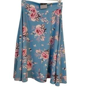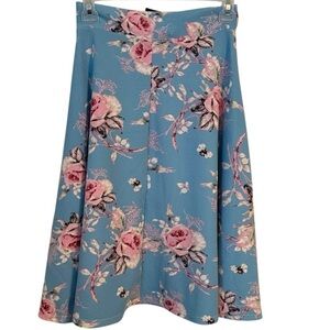 Charming A-line skirt with pink floral design. Soft and flowy fabric. Ideal for casual outings.