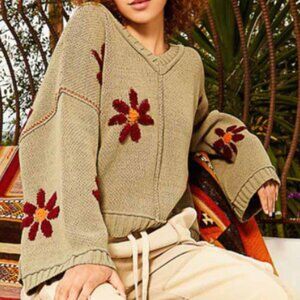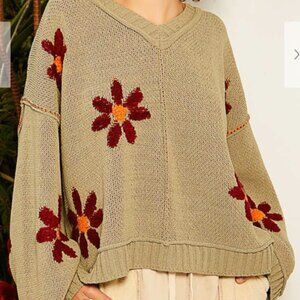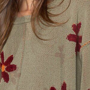 Designed in a slightly oversized V-neck with long sleeves, a relaxed fit top in chenille with outseam rolling edge detailing, a Berber flower print, and a pullover sweater.