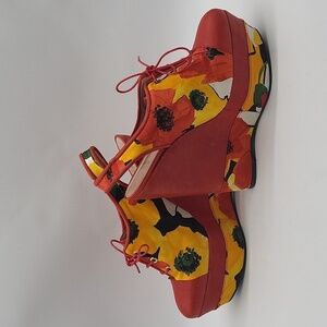 1053- Stuart Weitzman Red Floral Lace-Up Platform Wedge Heels Size 9