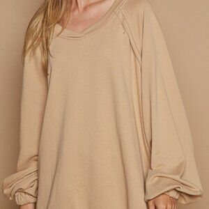 Designed in a relaxed fit, balloon long sleeves with outseam details, cross strap back details, side slits, french terry sweater top.