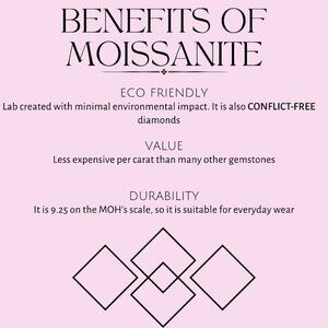Moissanite tests as a diamond on the thermal diamond tester and is the most BRILLIANT gemstone. It has a hardness score of 9.25 on the MOH’s scale for hardness, and more durability than sapphire, ruby, or emerald. Diamond scores a 10 in comparison.