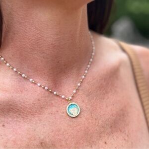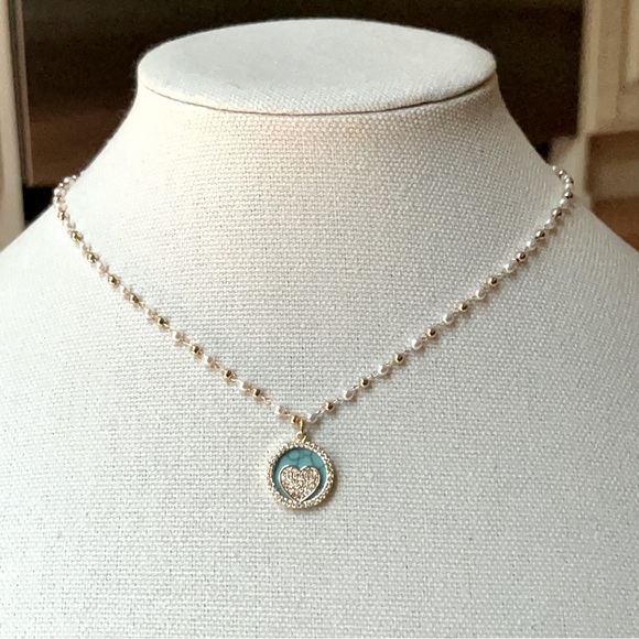 16” summer choker. Turquoise with a pave heart. Chain is pearl and gold bead. So pretty to mix with layers. Lobster closure