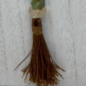 Hand-knotted on silk cord. quartz, yellow jade 8mm beads. bottom has raw quartz & peridot above silk tassel